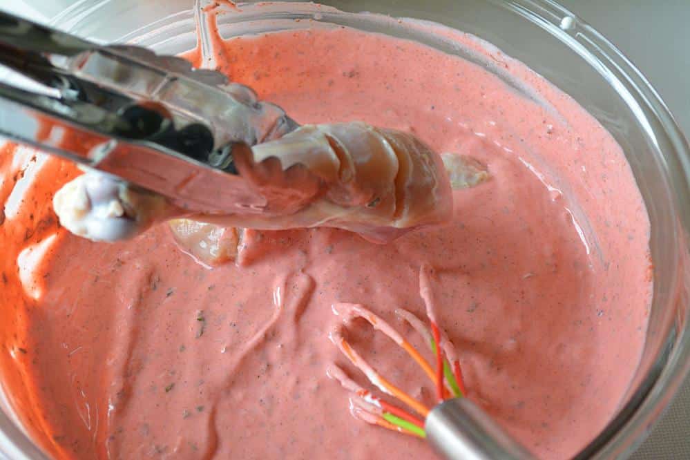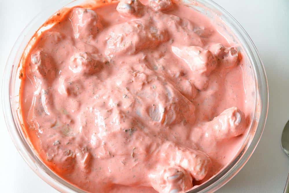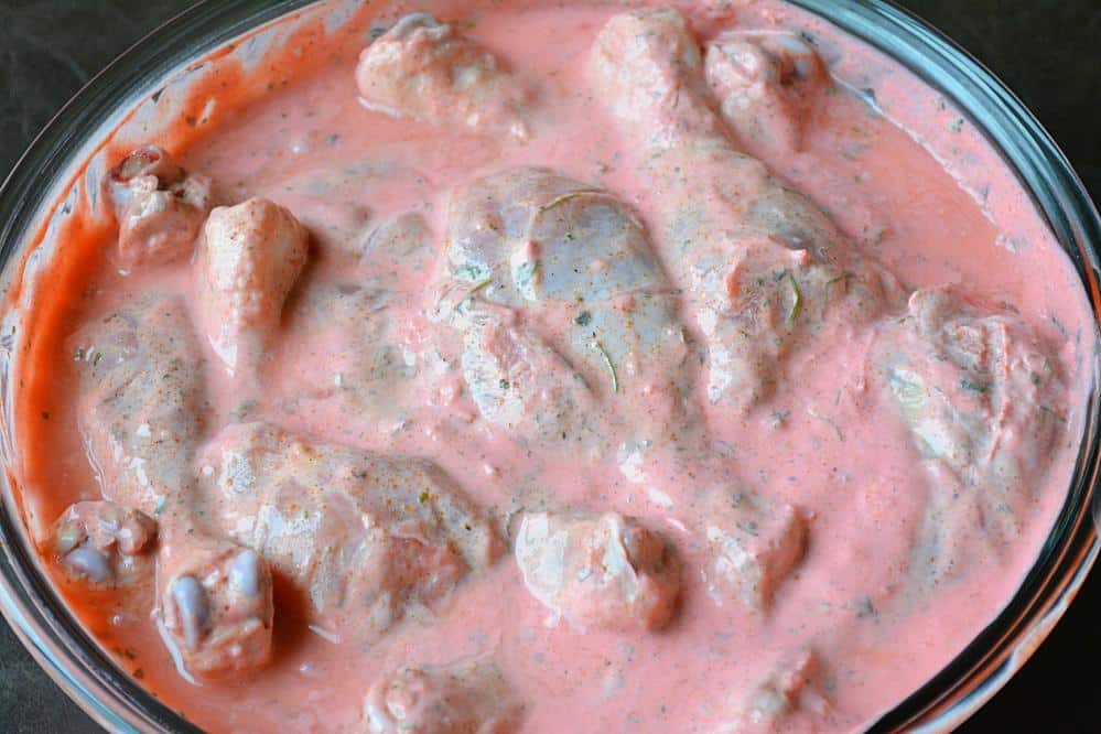 - Let's begin with the first marinade. Wash and thoroughly clean chicken pieces. In a big bowl add lemon juice and salt. Whisk it up and add chicken pieces.