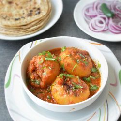 Prefer a thick gravy – add less water, same way if you like your gravy to be on a liquid-y side add more water. Adjust seasoning and continue with the recipe. Add or subtract spices as per liking – like it spicy add garam masala to the recipe. Sprinkle it with chopped cilantro leaves and enjoy with warm rice or roti.