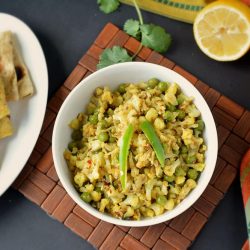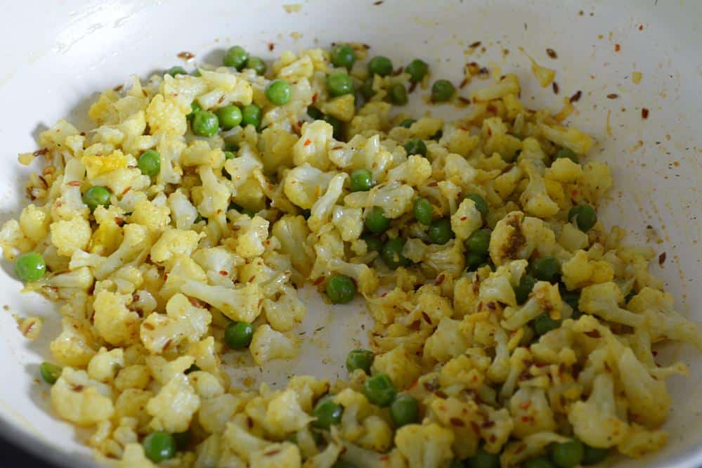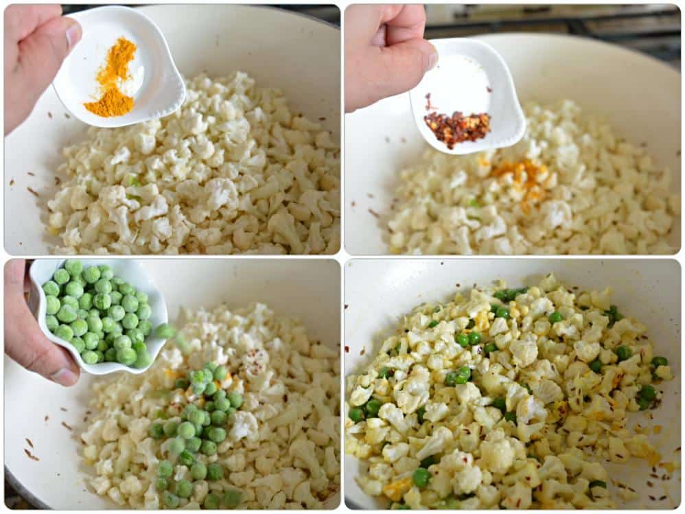 - Mix in haldi and red chili powder or flakes, peas and give it a good mix. Sprinkle some water...