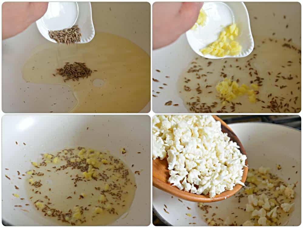 - Heat oil in a kadhai, add cumin seeds, ginger and saute for a minute. Add cauliflower florets..
