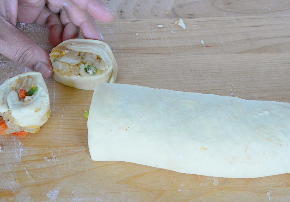Thanks for trying the recipe. Glad to hear that your family loved it. Next time try to dust the stuffed dough roll with dry flour and then run the knife through it. It should take care of the issue.