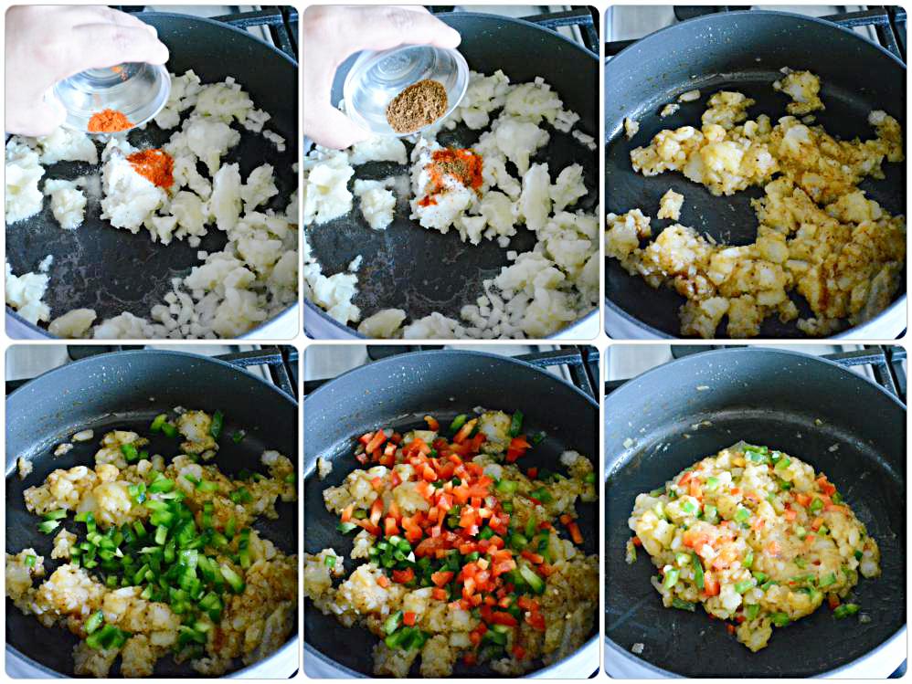 - Add all the spices and mix it well. Adjust spices according to taste. Take it off the flame and mix in red and green capsicum.