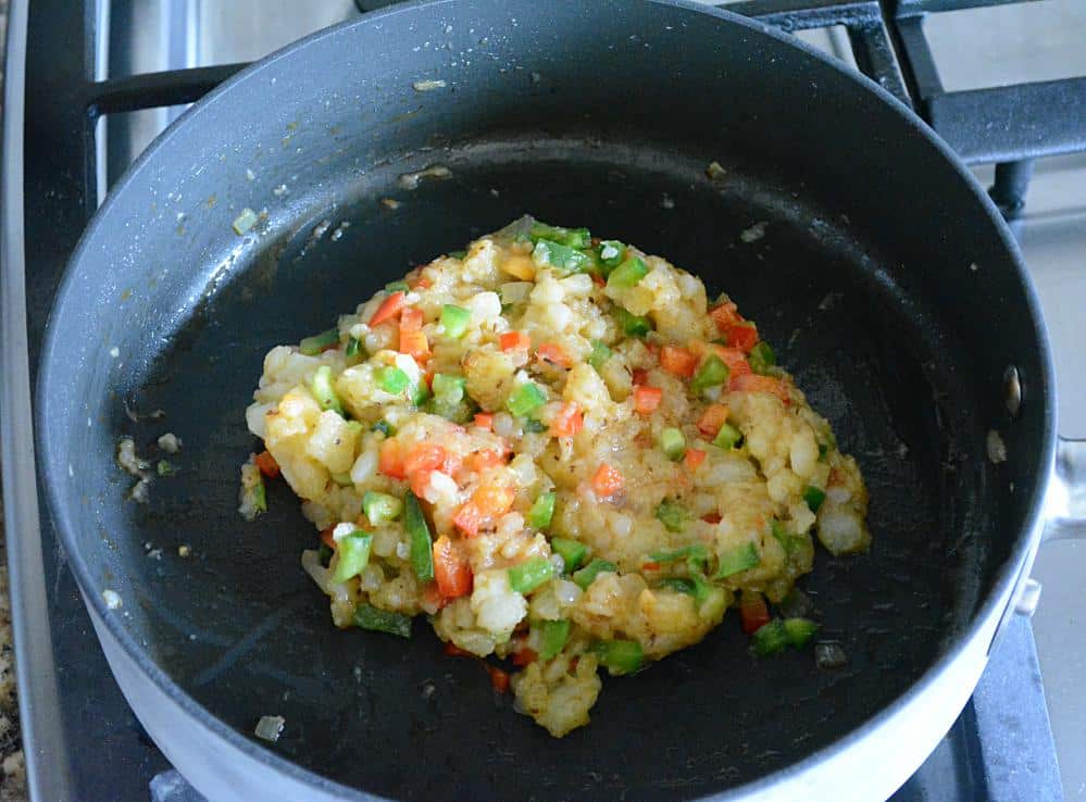 - Heat oil in a pan. Add onions and saute until onions are translucent. Mix in mashed potatoes.