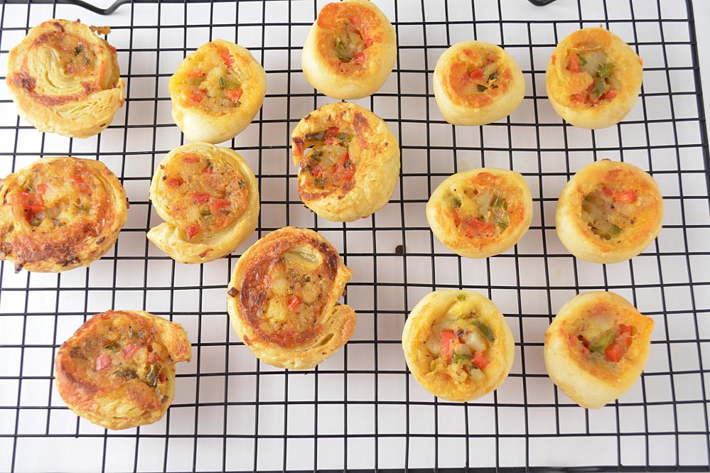 Congratulations on your new home Divya!! This is what I do – Place store bought puff pastry sheets on the counter for 30 minutes. Dust the sheets with some dry flour and flatten them using a rolling pin. Spread the filling and roll the sheets up. Wrap the filled sheets in a plastic wrap and place them in fridge for 1 hour. Just before baking, cut them in rounds and bake as stated in the recipe. Bake them in batches until all the pinwheels are baked and brown. Before serving keep them in warm oven for 20 minutes and you are good to go!! Have fun. 🙂