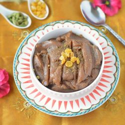 Six ingredients is all you need to prepare this simple yet delicious halwa. Very versatile recipe – the two flours mentioned below can be swapped with any other vrat flour.