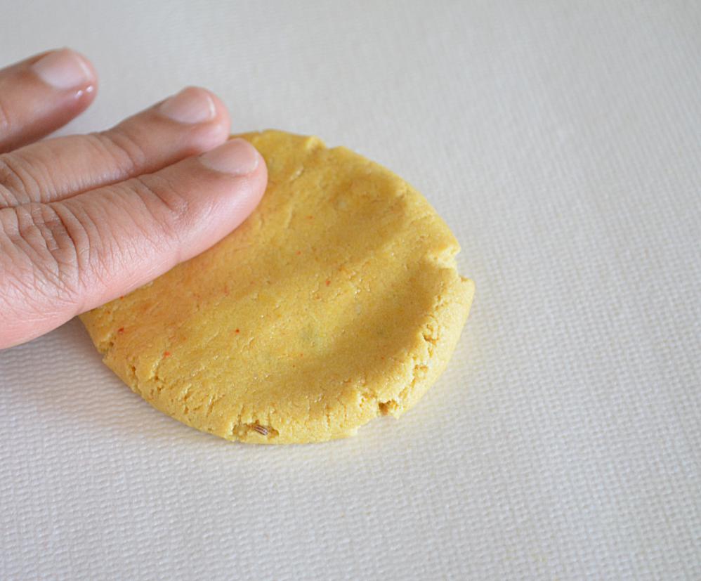 - Using your fingers or palm keep pressing down on the dough and form a puri like circle.