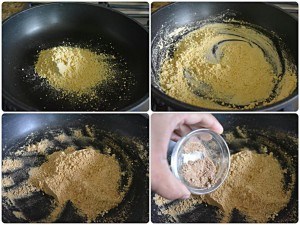 In a kadhai dry roast besan on a low heat till it starts to omit its aroma and change color from yellow to light brown.
