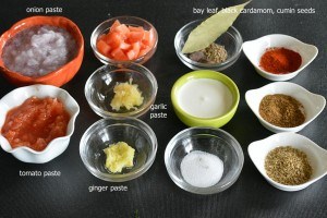 In a kadahi heat oil or ghee and add bay leaf, cumin and black cardamom. As they brown up add ginger-garlic paste and cook for few seconds.