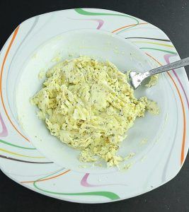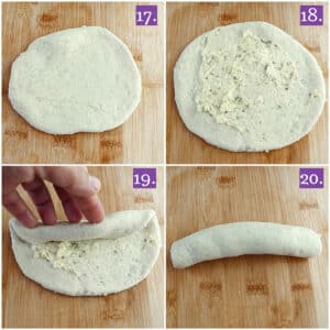 Preheat oven to 350°F. While the oven is heating, let’s shape the dough. Dust the surface with flour and transfer the kneaded dough onto the dusted surface. Punch down the dough and knead it for 2-3 minutes. Divide the dough into equal parts.Roll the dough into smooth round balls. Flatten the dough. Apply a single layer of garlic spread to the flattened dough. Start rolling the dough until it looks like a log.