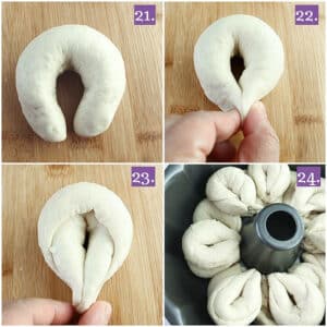 Fold the dough so that the two ends meet each other. It will form a big ‘O’. Pinch the ends together. Start arranging them in the greased bundt pan. Repeat the process with the rest of the dough.