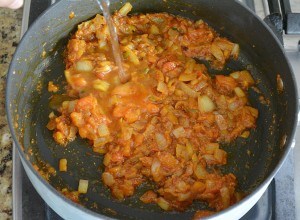 Mix in chopped tomato and tomato puree. Mix and add spices.