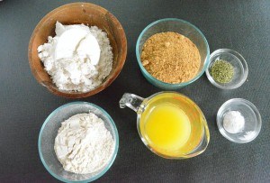 Sift flour and baking soda together. Add roasted saunf and pour ghee in the center.