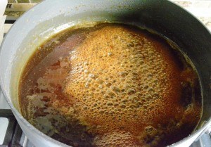 Gur/jaggery burns very fast, so do not leave the syrup unattended and keep stirring it continuously.