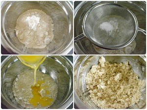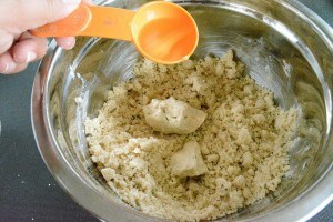 Gradually work on the flour till mixture is crumbly. Use fingertips to rub ghee evenly into flour.