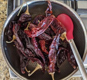 Add dried Kashmiri chilies to a heavy-bottomed pan and dry-roast them (stirring occasionally) until fragrant. This will take about 6-7 minutes over medium heat.