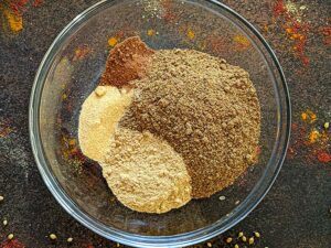 Combine garlic powder, ginger powder, nutmeg powder, salt, and beetroot powder in a large mixing bowl. Add the powdered whole spice mix to it.