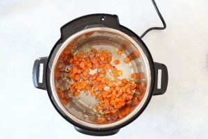 First, rinse the beans well under tap water for a couple of minutes. Set it aside. Press the saute button on the Instant Pot. Add olive oil, onion, and garlic.