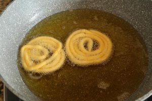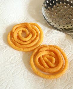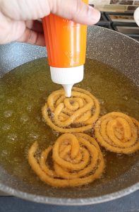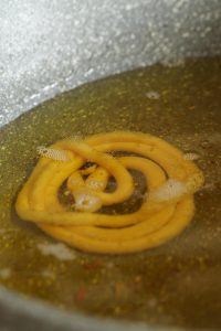 Once in the oil, allow the jalebis to cook undisturbed for 10-15 seconds; this step will help them hold their structure in oil. Soon, they will float to the top.