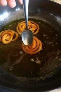 Once the Jalebis are out of hot oil, dip them immediately in the warm sugar syrup. The sugar syrup should be warm at all times. Warm but not boiling.