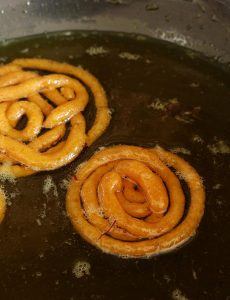 Now increase the heat, flip the jalebis and cook from both sides until crisp.