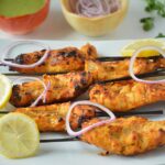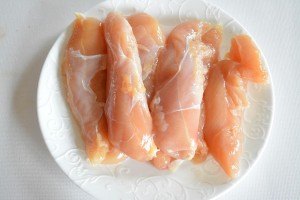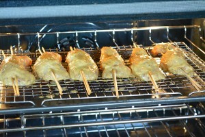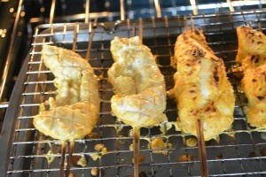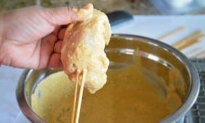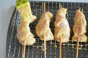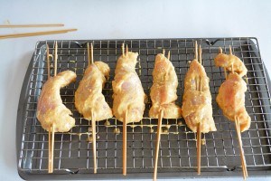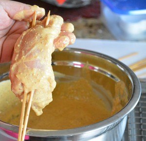 Remove the skewers from the water. Holding the marinated chicken in one hand insert skewers.