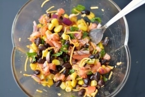 In a bowl assemble all the ingredients one by one - leaving out cheese.