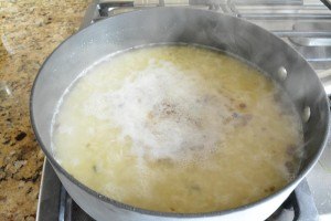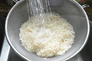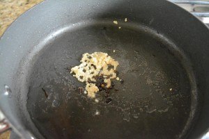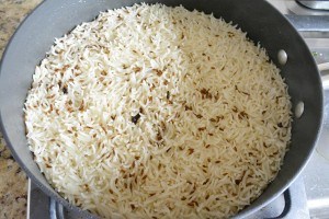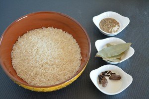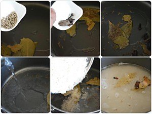 Saute for few seconds and add cumin, bay-leaves, cloves and black cardamom. Pour in water salt and add rice.