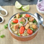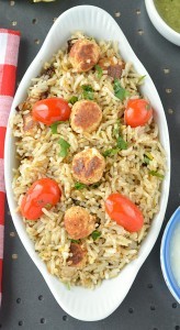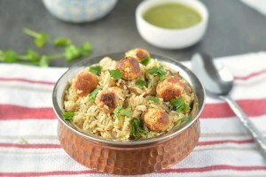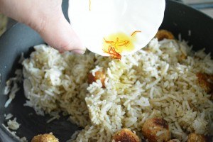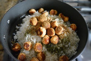 Remove the lid, fluff rice with fork and add in rest of the spices and motis.
