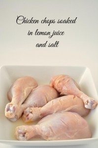 Make horizontal slits across each chicken leg for the marinade to penetrate into the meat. Mix in lemon juice and salt and rub it thoroughly over the chicken pieces. Let it sit for at least an hour.