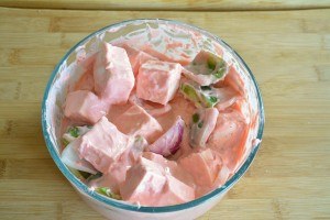 Toss cubed paneer and veggies in the marinade and rub the marinade all over the paneer and coat it well. Marinate it for 2-3 hours.