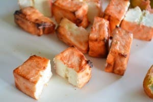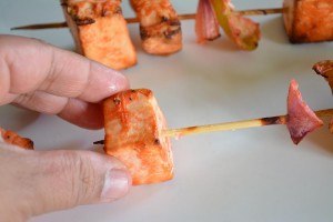 After the marination time, put paneer and veggies on skewers, alternating the veggies and paneer pieces.