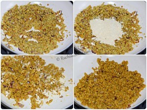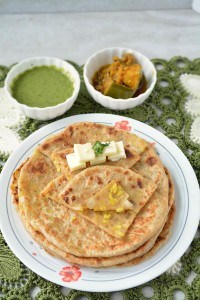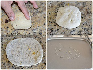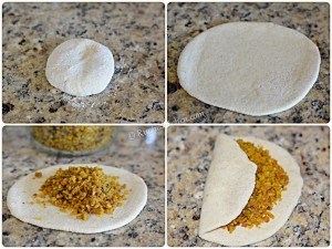 Take a small ball of dough, roll it in a form of small circle. Place 1 tablespoon pithi ka masala in the center and as shown in the picture start folding the paratha.