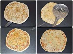 Using a spatula - keep pressing paratha from all the sides so that it is evenly cooked and starts to brown up.