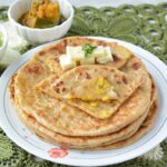 Your stuffed pithi dough ball is ready to roll. Dust the counter or surface with flour and using a rolling pin start rolling out the paratha. Heat the griddle or tawa on a medium flame and sprinkle some oil over it.