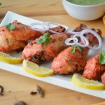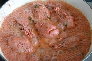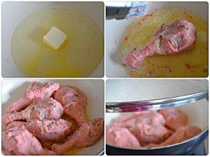 In a pan heat butter or ghee. Add chicken one by one. Cover and cook for 2-3 minutes.