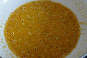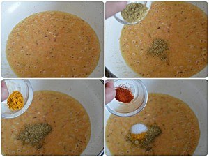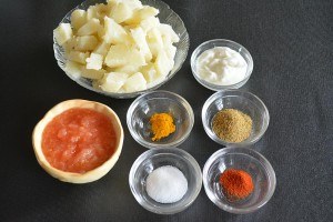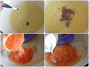 In a pan heat ghee and add cumin seeds. When they start to sputter add tomato puree and curd.